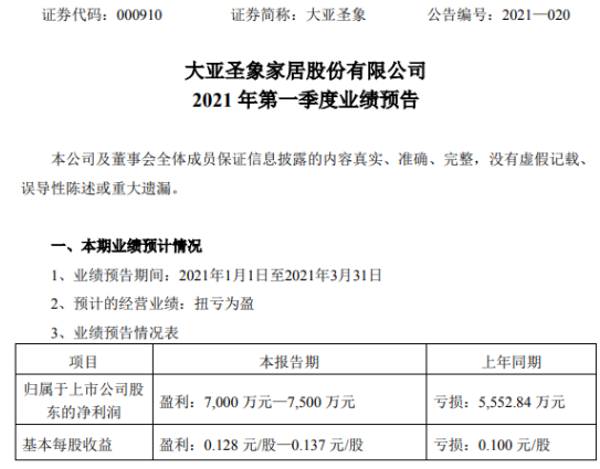 挖贝网4月14日,大亚圣象(000910,股吧)(000910)近日发布2021年第一季度业绩预告,预计业绩同比扭亏为盈。报告期内归属于上市公司股东的净利润7,000万元—7,500万元,较上年同期扭亏为盈;基本每股收益0.128元/股—0.137元/股。